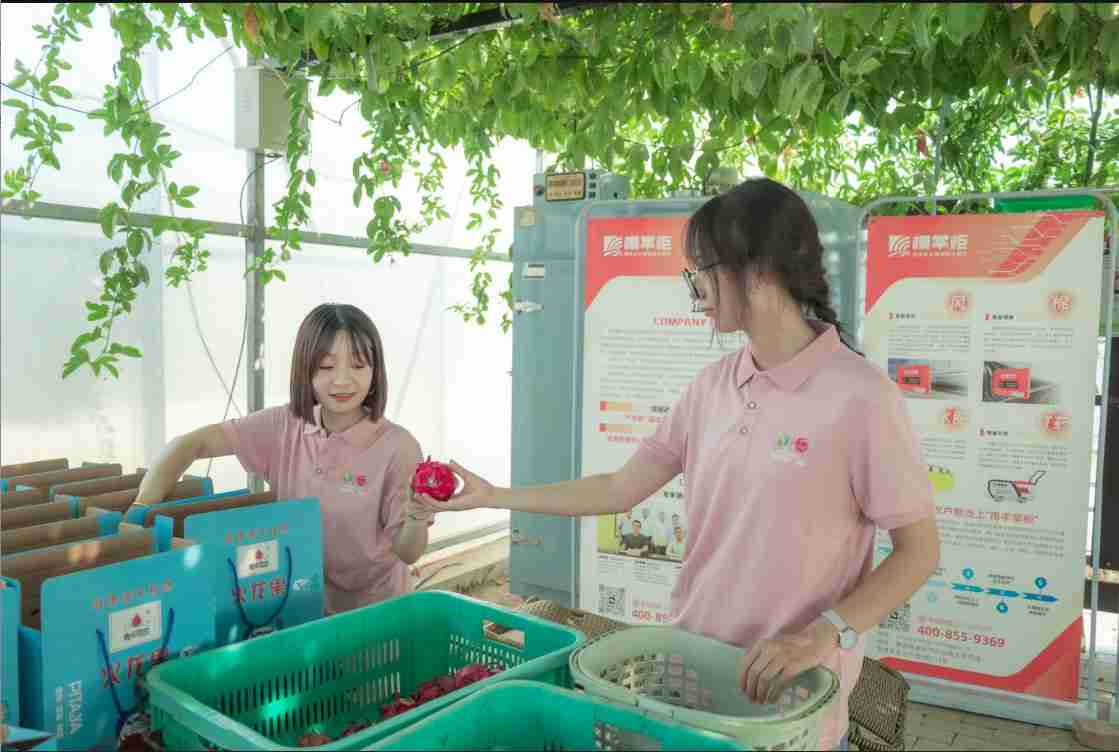 在基地的智慧大棚里,深紫色的“女魔頭”、紅白相間的“新雙色”、金黃的“以色列黃龍”等各種火龍果長勢旺盛。實踐團成員們變身“采果匠”和“分揀員”,在技術員指導下學習輕托慢剪的采摘技巧,親手收獲沉甸甸的果實;在分揀包裝環節,他們運用果徑測量儀科學分級,參與包裝,親身體驗了現代農業的標準化與品牌化運作。當負責人王艷提到:“這些鮮果將通過冷鏈物流快速送達全國,讓全國各地消費者都能及時吃上新鮮的水果。”時,同學們深刻感受到了現代科技如何保障“從枝頭到餐桌”的新鮮與高效。